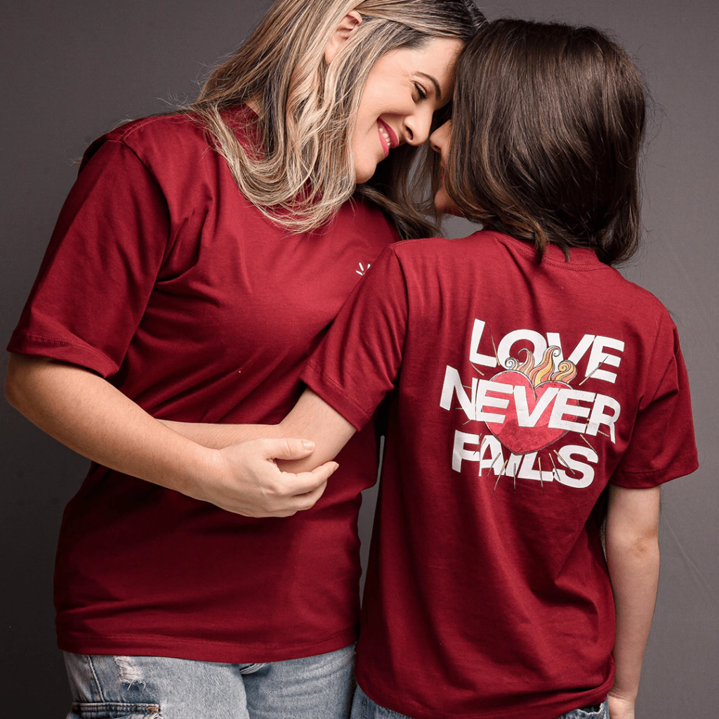 Na parte frontal, um detalhe sutil com um coração minimalista. Nas costas, a mensagem em destaque “Love Never Fails” é acompanhada por uma ilustração poderosa que simboliza a intensidade e a verdade do amor, inspirada no versículo de 1 Coríntios 13:8.
